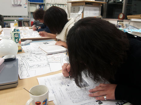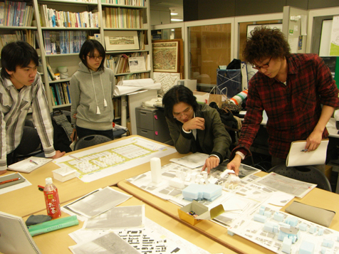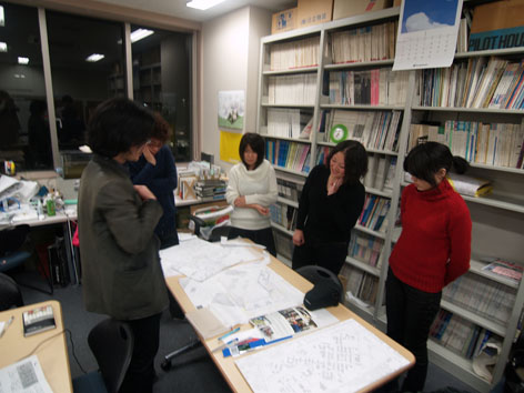 1月16日(水) 晴れだけどすごく寒い 今日は、今週末の締め切りに向けた卒制梗概チェックと、 作業全体の進行状況報告を行いました。 B4全員、文章やダイヤグラム、パース図など様々な表現方法でまとめていましたが、 全体的に「工夫しながらもっと情報をふんだんに盛り込み、計画の魅力を分かりやすく伝えること」が提出までの課題として挙げられました。 A4用紙両面1枚という限られた平面スペースでの表現はとても難しい作業ですが、だからこそ良い意味で欲張って、自分の計画を最大限に分かりやすく伝えて欲しいと思います。 なお、修士2年は昨日夕方に梗概提出を終えました!お疲れさまです。 提出日のM2ブースは、ものすごい集中力と人口密度でとにかくすごかったです…。 修士1年も就職活動が本格化してきました…。 全員わたわた気味な1月中旬ですが、ここは精一杯がんばりましょうー。 その先にはきっと楽しいことが待っている(ハズ)!!! M1:Kato
